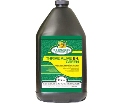 This blend of seaweed and vitamin B1 combine to optimize soil conditions for greater root mass. It can be used as a foliar spray and for root zone applications. Thrive Alive B-1™ Green is a powerful preventative and restorative general-purpose plant tonic. This product contains nutrients which are cultured in premium quality British Columbian kelp and seaweed that optimize conditions for plant growth, and vitamin B1 to reduce transplant-related issues.